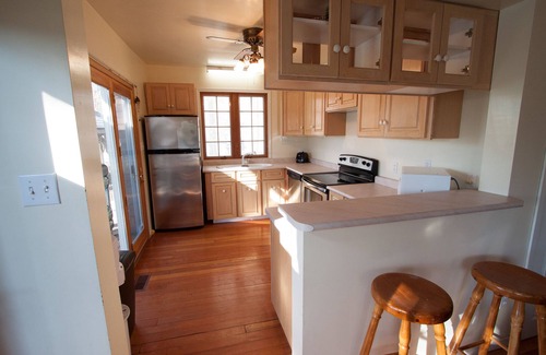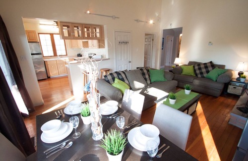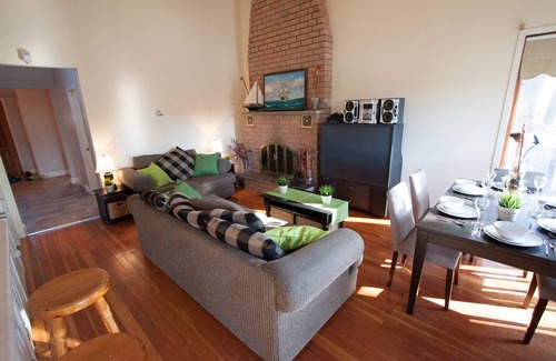 The dining area will seat 6 comfortably and another two at the bar that creates a divide for the fully equipped kitchen, complete with everything you expect to find in a typical kitchen, fully stocked stocked with cookware, stemware, dishes and cutlery. Our cottage has 3 bedrooms, all hosting double beds and a full bathroom that provides lots of space for getting ready to have a night out on the town, where all the entertainment is within just a short walking distance.