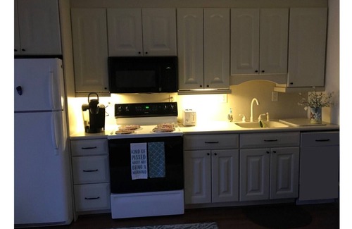 The unit has a fully equipped kitchen including a refrigerator, 4-burner stovetop with an oven, a microwave, a tea kettle, a toaster, a blender, a Keurig, a drip coffee maker . The kitchen also equipped with cooking utensils, dishes, and cookware.