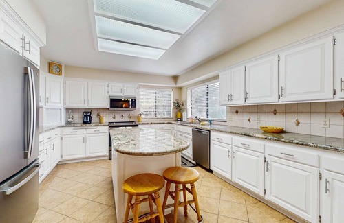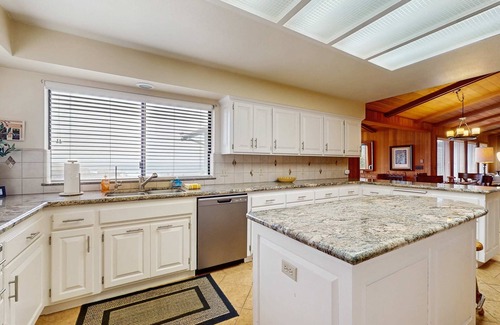 Drift into the updated gourmet-sized kitchen for a casual lunch or utilize the fully stocked appliances and equipment for formal evening seating. Granite countertops, stainless steel appliances, light wooden cabinetry, and an ocean view are sure to inspire a sincerely Pacific culinary creation!