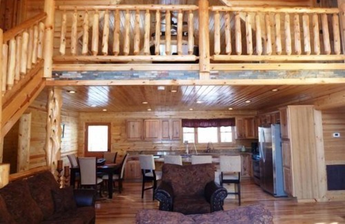 The upper loft area is equipped with two bedrooms with queen size log beds.