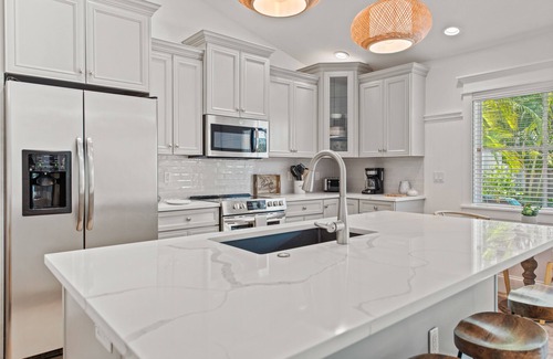 Retreat to the primary bedroom, featuring a king-sized bed, a TV, and a private ensuite bathroom with a luxurious walk-in shower, natural stone accents, granite countertops, and a relaxing ambiance. The second bedroom includes a queen bed and easy access to the hall bathroom, which has a shower-tub combo. The third bedroom offers a twin-over-full bunk bed with a pull-out twin, ideal for kids or extra guests, and also has a flat-screen TV. All bedrooms are crafted to ensure restful nights and island comfort.
