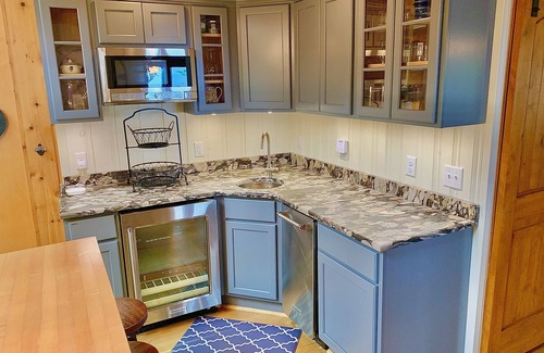 The kitchen, island, and bar area, are set up for entertaining a large group. A chef's stove and stainless cookware make for grand meals indoors. Or cook outdoors in the new outdoor kitchen with beverage fridge. The indoor kitchen boasts a wet bar with beverage fridge and stand alone ice maker to help ensure the beverages keep flowing.