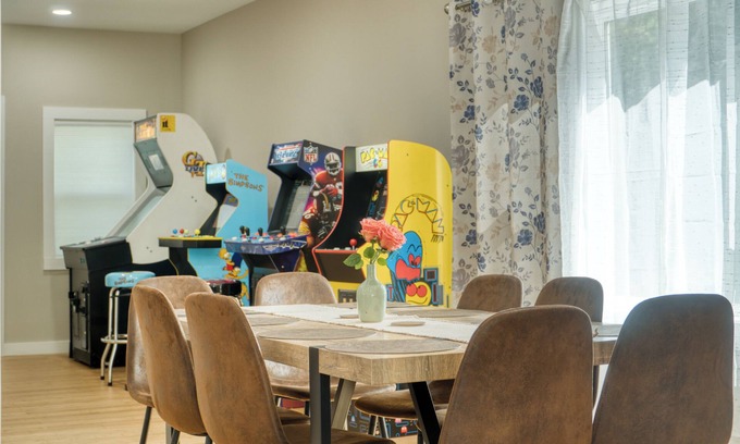 -Game room with classic arcade machines: Pac-Man, Golden Tee, The Simpsons, NFL Blitz