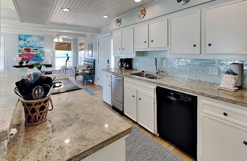 Inside, you'll find 1,562 square feet of open-concept living space decorated in breezy, coastal-chic style. The spacious living area features a large TV and queen sleeper sofa, creating a cozy hub for movie nights or family game sessions around the nearby round table. The kitchen is a chef’s dream with granite countertops, dual ovens, and a dedicated ice maker—perfect for prepping meals or refreshing beach-day drinks.