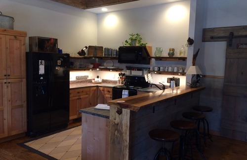 Our cabin is a one level, bright and airy, easy access bungalow featuring 2 bedrooms, 2 full baths and a full size kitchen including refrigerator, range, microwave, and dishwasher. The vaulted kitchen/dining/living area features 100 year old heart pine beams, a poplar & maple live edge bar top, wood burning fireplace and queen sofa sleeper. The spacious Master bedroom features a king size bed and private bath. The second bedroom is furnished with a queen size bed and bunk beds. The second bathroom, with full size tub/shower, is located just across the hallway. The oversize mudroom has a full size washer and dryer, laundry sink, and ample space for indoor bike storage. Outside is a convenient bike wash station, a charcoal grill and fire pit with firewood provided.