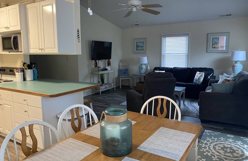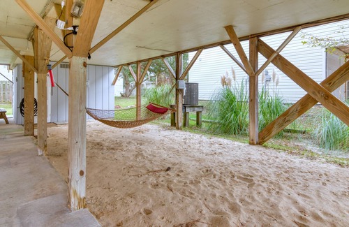 After a great day on the beach, come and enjoy an outdoor shower and take a nap in the hammock or read a good book on the deck. The kitchen is well stocked for cooking meals at home and there is also a gas grill for your use. Staying at the Salt Box will provide you with all you need to make a memorable vacation with your family and friends. Our cottage has 3 BR and 2 BA, kitchen with bar area as well as an eat in kitchen. The living room provides a 55 inch flat screened TV with smart tv functionality, along with a Wii and plenty of video games and movies. The master bedroom has a King size bed and an attached full bathroom along with a flat screen TV, the second room has a Queen bed and smart TV and the third room has a bunk bed with a full on the bottom and twin on top and a flat screen TV/DVD player. Linens and towels are provided but we do recommend you bring your own beach towels. There is a washing machine and dryer in the utility room downstairs. We offer four bikes for riding on the bike trail along the sound side. The back yard is perfect for a game of corn hole (set in laundry room) or for the kids to play.