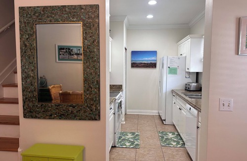 This house is a 3 bedroom stand alone unit with 2 king bedrooms upstairs with balconies and own bathrooms and the bedroom downstairs has two twin beds which could be converted into a king upon request and also has it's own bathroom. There is a queen sleeper sofa with a screen divider for privacy if needed. Pool is just across the way in the center of the complex. Propane grill on back porch. Has a Kuerig and a regular coffee pot.