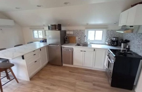 While this apartment is compact it can accommodate up to 5 people. One private bedroom with a queen size bed and a built-in twin size sleeping nook tucked around the corner complete with a ladder. A full size bed in the open concept living area accommodates up to two comfortably.