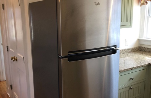 The Cottage's lower level consists of a welcoming tiled mudroom containing your own private laundry facilities and access to the upstairs apartment. The spacious upper full-floor, studio apartment features a king bed, drop-leaf dining table, comfy living room seating and state-of-the-art bathroom and kitchen. The beautifully renovated, tile and marble bathroom includes an enlarged shower stall with rain shower head and hand controls with a lovely vanity and commode and is supplied with premium toiletries and plenty of stored extra bath and beach towels. The updated kitchen includes a stainless-steel refrigerator-freezer with automatic ice maker, top-of-line dishwasher, solid surface range and oven, and an array of smaller appliances (microwave, automatic drip coffeemaker, automatic can opener, toaster oven) along with every conceivable kitchen aid and houseware item you might need to make your visit pleasurable. Cable TV and WiFi is provided at no additional charge.