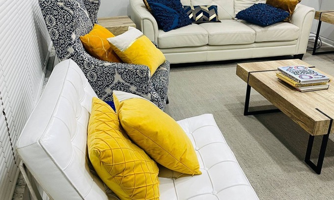 This spacious modern townhouse apartment is situated in a secure and pleasant area of Oak Park, close to shops, hospitals, the police station, and the highway. The impressive basement includes a projector, half bathroom and a large bar, perfect for entertaining friends and family. Enjoy year-round outdoor relaxation on the covered porch. The main bedroom features a queen bed and a private projector, while the second bedroom is equipped with two bunk beds. The full bathroom includes both a shower and a bathtub. Additionally, there is a formal dining area with seating for six, as well as a breakfast nook with its own table and chairs.