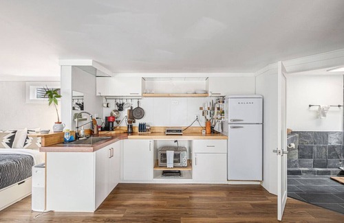 The kitchen and dining nook are compact yet fully equipped for your needs. A high table with two chairs provides a spot for meals or morning coffee, while the micro-kitchen features a smart oven, single burner, Nespresso machine, and all the necessary supplies. The retro-style fridge/freezer adds a touch of character while keeping everything fresh. Whether you’re cooking a quick snack or enjoying a casual dinner, this space makes everyday moments feel comfortable and inviting.