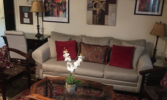 This charming and comfortable casita with a private entrance and code, and dedicated off street parking, for guests has everything needed for a home away from home or working remotely. With premium, comfortable beds and luxury linens, large flat screen smart TVs, and premium cable channels, you are all set for working or for a comfy nest to relax. Included in the well-appointed kitchen are a Ninja Foodi and Keurig - along with everything needed for preparing meals, but if you don’t want to cook, the property is within pleasant walking distance or a short ride to many excellent dining and take out options.