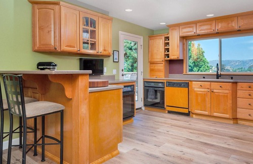 Sitting on a hilltop with gorgeous views overlooking Escondido and it's rolling hills this charming home has everything you will need for a San Diego vacation or work away! This home has it's own private gate to ensure maximum privacy, a large front lawn, citrus trees for guests to enjoy, a game room, a large outdoor deck with a gas fire pit, a fully-stocked kitchen and much more! The first bedroom features a queen sized bed and personal TV. The second bedroom has a king sized bed, en suite, and in-room TV.