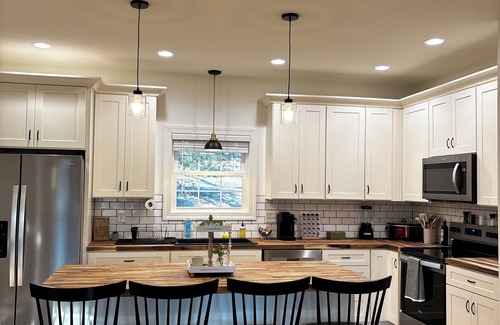 Welcome to The Windsor Cottage! Located in the heart of Bedford, at the end of a very private and quiet cul-de-sac. Our home was designed with families in mind, with room for 8 guests to comfortably sleep! King sized bed in the master, Queen sized beds in two front bedrooms, and a Queen sized bed in the sleeper sofa. Everyone will have plenty of room to stretch out and relax! Home is equipped with Smart TV’s in every room, toys, games, high chair, pack ‘n play, and all necessary essentials.
