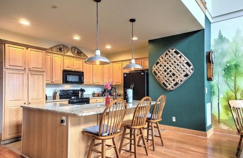 The spacious and open family room welcomes you with stunning mountain views and a cozy indoor fireplace. The fully equipped kitchen caters to all your culinary needs, and the spacious dining area is perfect for shared meals. The bedroom arrangements are as follows: Bedroom 1 has a king bed, Bedroom 2 has a queen bed, Bedroom 3 has a king bed, and Bedroom 4 has a twin over full bunk bed. The lower-level game room with a pool, ping-pong, and TV ensures endless entertainment.