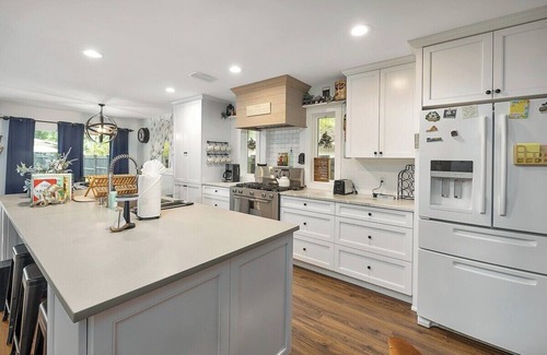 The fully fenced in backyard has a beautiful salt water pool, surrounded by a tree canopy, 4 pool chairs, yard games, and a gas grill, ready for family fun in sun. A wall of glass doors, invites guests into our open living space with a gas remote stone fireplace, smart tv with sound bar, and unique white leather reclining couch. Our backyard is regularly treated for mosquitos to make for an even more relaxing atmosphere. The glass door is also has an air curtain to help you cool off on a hot day. Opening up to the kitchen, fully equipped, with a gas range, traditional coffee pot, and whole house water softener. There is plenty of seating for the whole family with 8 chairs and 3 bar stools, on the island. Also located in the main living space is the washer and dryer behind modern barn doors.