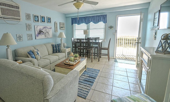 The bedroom has a queen bed and very sturdy bunks consisting of two twin mattresses. (Guests must provide their own linens and towels ) There is plenty of drawer space and newly updated plank flooring. The kitchen is well stocked and has a 2 burner cooktop, microwave oven, plenty of extras and a drip coffee maker plus a Keurig. The bathroom is completely updated. It is clean and bright with a tub and shower combo. The sitting room is tastefully decorated consisting of a couch, love seat, coffee and end tables, Smart TV in both living room and bedroom. Hulu is provided for viewing, live TV, sports, kids programing, and streaming shows. The dining table is conveniently placed next to the window so you can enjoy the beautiful view. If you prefer to dine “Al fresco” Summer Sands boasts several decks with *tables and umbrellas for all guests to enjoy. The property also has many sun loungers, two heated swimming pools, 6 gas grills and an elevator for your convenience. This condo comes with a one car assigned parking spot.