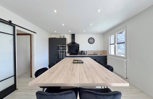 => a kitchen/dining room area with an ultra-contemporary design with all the useful and essential equipment (oven and microwave, fridge-freezer, hotplates, dishwasher, Nespresso and filter coffee makers, toaster, kettle, crockery and utensils) and a huge central island forming a dining table with 10 adjustable seats.