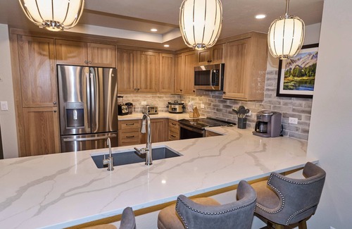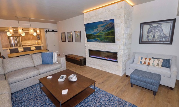 We've left the old interior photos of the property on our listing for now to reference unit size, space and layout. We have gone with a light grey interior base color with hardwood-look durable flooring and a Scandanavian flair to the cabinetry throughout the kitchen and bathrooms. Light quartz countertops keep the rooms light and bright. We ditched the old brick wood burning fireplace for quick and easy heat with an electric fireplace and 65 inch television to relax après-ski! We are a honestly a little worried our comfortable home and view will be so nice that people won't want to go out and explore Breck!!
