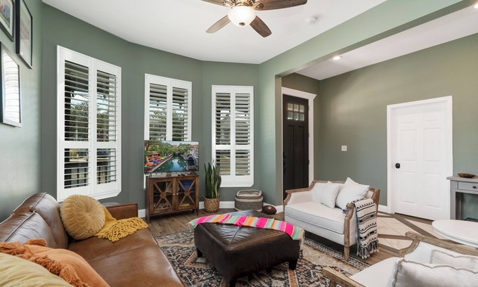 Enjoy a peaceful stay at this charming 2-bedroom house in San Antonio, close to Downtown, the Zoo, the Riverwalk, and more! This stylish retreat offers a cozy experience for guests to make memories in, or simply relax in peace and quiet. We have thoughtfully stocked the home with high-quality comforts. The main bedroom has a queen bed and closet storage. The second bedroom has two comfortable twin beds, a small sofa, and a large closet with an air mattress, and two fold-out beds. The bathroom is equipped with a stylish double-sink vanity, toilet, and a shower-tub combo. In the living room space, you can unwind on the couches, gather around for games and movies, enjoy a quiet read, or set up the pull-out beds. The kitchen area has a coffee bar and tons of seating. Stay connected with speedy fiber-optic WiFi, and have fun exploring all amenities offered, such as SmartTV, games, books, kitchenware, and more. Experience what San Antonio has to offer with a stay at our charming house.