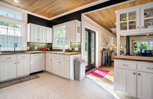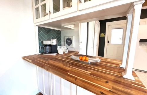 Inside, the cottage wraps you in warmth with rustic decor, historic wood floors (salvaged from the original Burleson Stop on the Fort Worth Railroad), and a light-filled open layout. Whether you’re curled up with a good book, cooking a family meal in the fully stocked kitchen, or playing a late-night board game in the sunroom, this space invites connection and calm.
