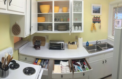 -Fully stocked kitchen with appliances/utensils (no dishwasher) This includes a Mr.coffee drip style machine, French press, Stovetop espresso, Keurig single cup machine, & Glass poor-over.