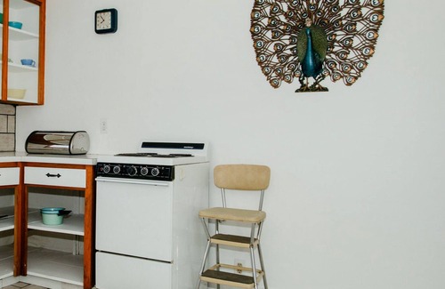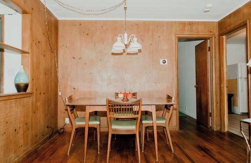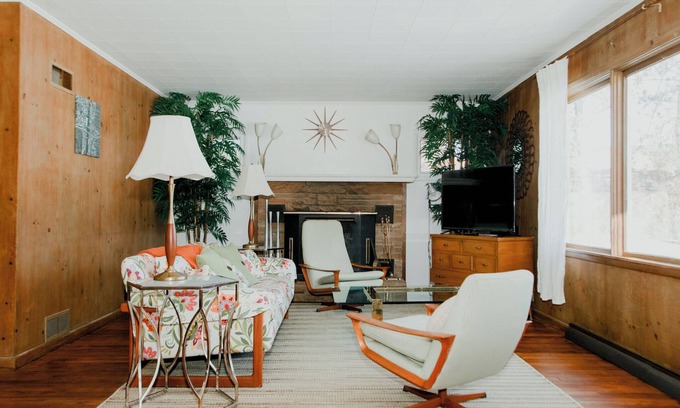 Step into a nostalgic retreat where light floods the mid-century living room. Relive the past surrounded by vintage charm and the soothing melodies of our Zenith record player. Take in the night sky as you relax in the hot tub. Book your stay today!