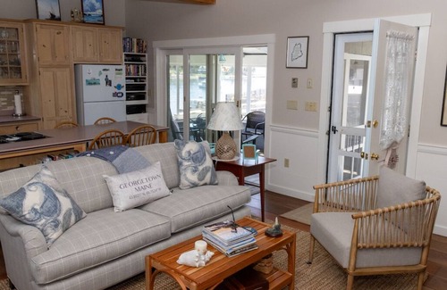 The Cottage is a fully furnished 900 sq ft two bedroom with full kitchen, bathroom and living space. The main bedroom features a queen sized bed. Our guest room houses two twin sized beds. The living space is complete with everything from books, puzzles, and board games, to a television with Dish cable and a small movie collection; perfect to relax and unwind and unplug with your loved ones. The gourmet kitchen is fully equipped with a range, convection oven/microwave and coffee pot to make a delicious breakfast before you go out and explore Maine or to prepare beautiful dinner to end a night of fun. My favorite thing is the fully enclosed screened in porch with electric grill, and rocking chairs just in view of the ocean and warf where you can watch one of the most astonishing sunsets Five Islands has to offer. Perhaps you prefer to step outside where there are two poly-wood jointing Adirondack chairs facing the water perfect for catching some sun and enjoying the scenery or sitting out under the stars.