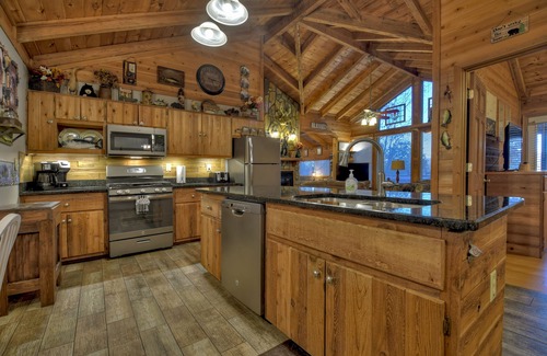 The interior of Chinook Cabin is thoughtfully furnished with whimsical "cabiney" décor, featuring bears, deer, fish, and humorous plaques to keep you smiling throughout your stay. All living spaces are conveniently located on one level (just 4 steps lead to the front door). See the floor plan of the cabin in the photos!