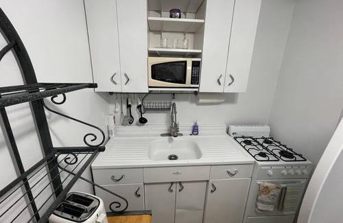 The studio has vinyl floors throughout. Full kitchen with everything you need: Pots, Pans, Plates, Utensils, Glasses, Cups, Coffee Maker, Stove & Oven and Full Sized Refrigerator. Relax seated on the patio reading a book or playing a guitar taking in the luke warm and breezy air.