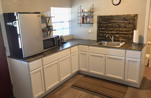 The bedroom has a queen sized bed. Living area has a 42in flat screen tv, cable, DVD player, and a very comfy leather couch. Kitchenette has a sink, small fridge, microwave, coffee maker, toaster and two burner stove top. An outdoor grill is also available.