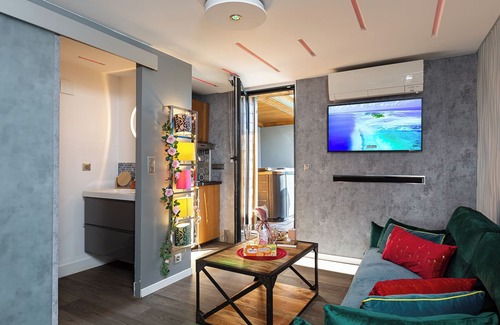 Modern, air-conditioned 20m² studio with private jacuzzi, which can accommodate 2 to 3 people in top-of-the-range conditions.