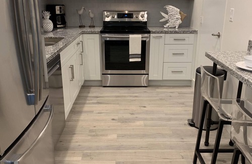 => Kitchen has new cabinets with granite countertops and is fully equipped with everything you will need during your stay. An eat-in counter is also available with seating for two.
