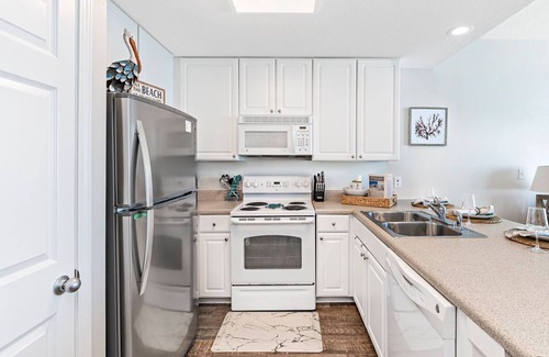 Inside, our open floor plan offers beach views from the kitchen and living room, as well as the Master Suite! Our flexible floor plan allows additional guests to settle in our cozy bunk room with twin/twin professionally built-in bunk beds or snuggle up on the brand new queen size sofa bed with memory gel foam mattress to enjoy a late night movie or an early morning sunrise. There is an additional full bath located directly across the hall from the bunk room to accommodate larger families.