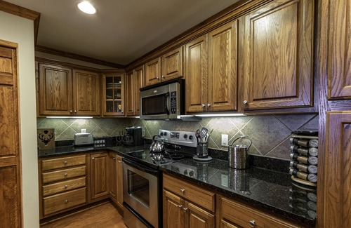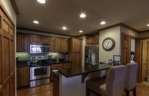 In the living area, the two-story, stacked stone gas fireplace, vies for your attention along with Grady and Earl, two antlered, taxidermy treasures, that appear to have just stepped in from the great outdoors, lending a rustic elegance to the lodge-like unit. You won’t miss the big game or your favorite TV program on the 65-inch Smart TV mounted over the fireplace. Netflix is provided as a courtesy and other streaming services are available if you have a personal subscription.