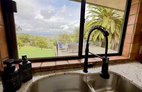 Best of both worlds! Spacious home full of natural light! Let the stresses melt away on 4.5 acres as you take in the peace of nature in Fallbrook. Best of both worlds- in nature yet only 3-5 minutes from Main St. and grocery stores. One story ranch home for Nature Lovers and those who love light-filled homes. We welcome families, wedding groups, etc. You will be greeted by floor-to-ceiling windows that frame expansive unreal views. Stunning views and wildlife. 2,400 square-foot home on 4.5 acres. Expansive unreal views at this courtyard home near wedding venues and local wineries. Great property for pictures that will take your breath away. Wake up from each overly spacious bedroom with the same gorgeous views and Smart TV in each bedroom. Enjoy a sunset dinner on the deck wrought iron patio table with plenty of chairs while soaking in the canyons and hills. Plenty of private spaces outside with a Sunbrella Patio Bed and many Sunbrella lounge chairs as well as patio seating in the Spanish Style Tiled Palm Tree Courtyard. Play corn hole in the backyard with artificial turf or nighttime games on the comfy living room furniture with room for all to sit and relax. Hear the laughs & cheers playing Foosball. Take your morning coffee and walk the natural trail on the property. Beautiful star gazing while lounging in the backyard. Take in the resort views of lush green canyons in the spring or ocean breezes and palms swaying in the summer, near the Santa Margarita River Hiking Trail; one of the most highly rated trails in San Diego County. Beach gear onsite for Oceanside and Carlsbad beaches. Visit local vineyards & hipster restaurants & craft breweries all within minutes of the property. You will be in nature hearing the sounds of birds chirping and picking fruit from the fruit trees while feeling private & secluded yet close to grocery stores and restaurants. No crazy mountain roads into the property and no crazy driveways to navigate. Close to Temecula and Fallbrook wine tastings and a short 5-minute drive to walk the up-and-coming Fallbrook Main Street with new organic restaurants and perfect for families visiting wedding venues or bridal parties getting ready for their special day. Perfect for family vacations that want to visit the San Diego Safari Park and Legoland, PGA golfing nearby, the extensive list of wineries in Fallbrook or Temecula, and about 50 minutes to downtown San Diego. Spend time in a comfy place!