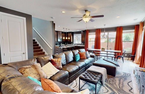 • Spacious Living Area: Step into a bright and airy living room designed for relaxation and connection. The oversized couch invites you to sink in and unwind after a day of exploring the stunning landscapes of Moab. With ample seating, it’s the perfect spot for family gatherings or cozy movie nights. Natural light floods the space through large windows, creating a warm and inviting atmosphere.