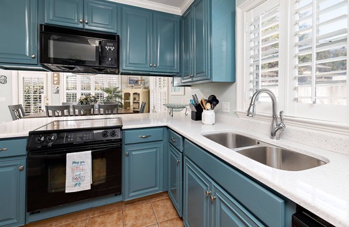 The large living area features a 65" HD Smart TV with plenty of seating including a queen sleeper sofa. Guests can spend time watching the game or a movie. The game table is a great place to gather as well! The dining area has plenty of room for guests to enjoy meals around the dining table that has seating for 8 guests. The kitchen space has been remodeled with new countertops, sink and a new kitchen faucet.