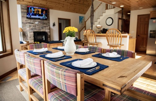 The chalet features an open floor plan on three levels. The top level features a master queen bedroom with a view of Nubs Nob. The master bedroom has an attached master bathroom for maximum comfort and privacy. The top level also has a cozy balcony perfect for enjoying a book.