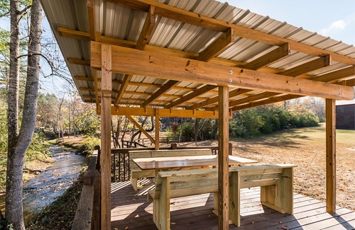 Metal roof covered gazebo w/ large picnic table and LED lighting overlooking creek