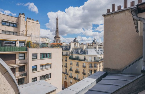 This family dupleix apartment is located close to the metro Passy at the top two levels of an Art Nouveau building with elevator on a small lane with nearly no traffic. It has an amazing Eillel Tower view from most rooms, an A/C unit in every bedroom and a large balcony.
