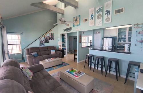 The den provides great views of the ocean and is open to the kitchen and dining areas. We have two large sofas with 2 reclining seats on each end of the sofas (4 recliners). The den, dining and kitchen have ceramic tile floors.