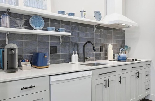 The thoughtfully designed kitchenette includes a refrigerator, sink, stovetop, microwave, dishwasher, and generous counter space. It is fully stocked with flatware, glasses, mugs, and essential items to support simple cooking and comfortable day-to-day living.