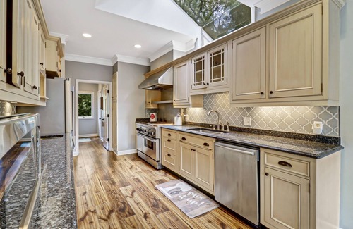 The kitchen has granite countertops, stainless steel appliances, and a Thermador gas range. There is a breakfast area that can seat up to four and direct access to the porch that leads to the private pool. The laundry room is just past the entrance to the kitchen. The formal dining room that can seat up to ten. Pull the custom barn door back and there is a small bar area with a wine fridge.