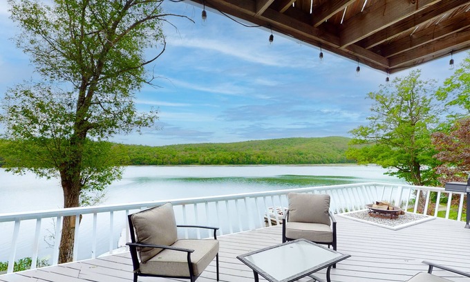 Swim and fish from the private dock or launch the paddleboat for a leisurely tour of the lake. Two kayaks and two paddleboards are also provided for group excursions. The spacious yard features a paver-stone patio furnished with a huge, campfire style grill perfect for a backyard fish-fry and table seating for four. For a more casual al fresco experience, fire up the gas grill on the deck and lounge on the cushioned patio furniture while dinner sizzles. A four-seater table with umbrella offers outdoor seating. A wood-burning fireplace provides cozy evening ambiance for starlight cocktails.