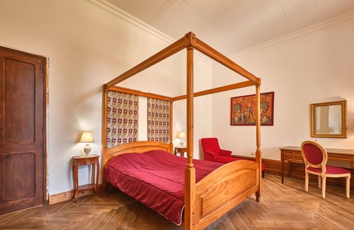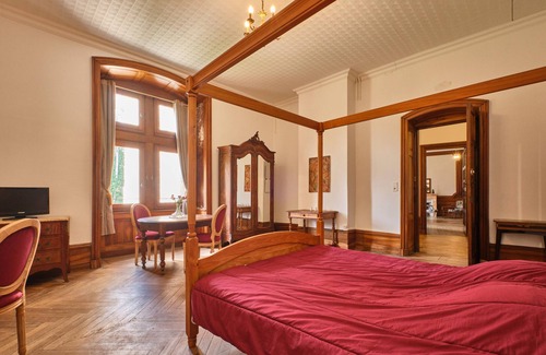 Guest house La Suite Rubis in Saint-Geoire-en-Valdaine provides 20 sqm of space for up to 2 guests. You have 1 bedroom with a 160cm bed and 1 bathroom with Italian shower and WC. The suite is located on the first floor of the Château and accessed via Donjon stairs. Your private amenities include breakfast available for an extra fee, dedicated workspace, and baby bed. Bed linens and towels are provided during your stay.