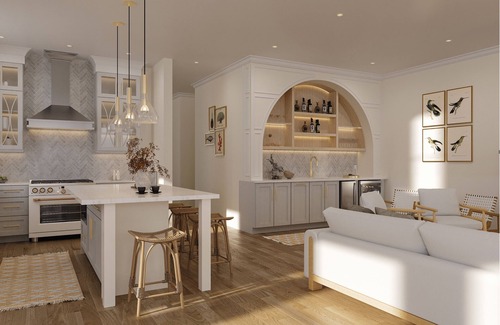 Adjacent to the pool, the carriage house boasts its own living area, kitchenette, laundry room, the 8th bedroom, which has a King bed and one set of Twin-over-Twin bunk beds (sleeps 4), a private balcony, and an en-suite bathroom with a glass shower. There is also a half bathroom (pool bath) on the first floor of the carriage house, right off the pool area.
