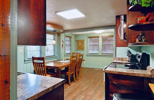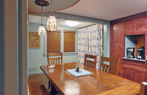 Across the hall from the Bunk Room is the fully renovated main bathroom. From the hall, you will also see the fresh and fun kitchen with beautifully refinished original cabinetry, stainless steel appliances, and a huge dining room table that can seat 6-8 people. The kitchen is appointed with a standard 12 cup coffee maker, an electric kettle, 12 sets of dinnerware (1 set includes: dinner plate, small plate, bowl cup, glass, spoon, fork, and knife), 8 wine glasses, 8 beer mugs, a stovetop cook set, basic bake-ware, casserole dishes, pizza pan, blender/food processor, mixer, toaster, large pitcher and general cooking utensils. The Kitchen has a door into the Theatre room, and adjacent to the kitchen are the washer and dryer and a space big enough to set up a queen air-bed if you are coming with a lot of guests (we don't supply any air beds).