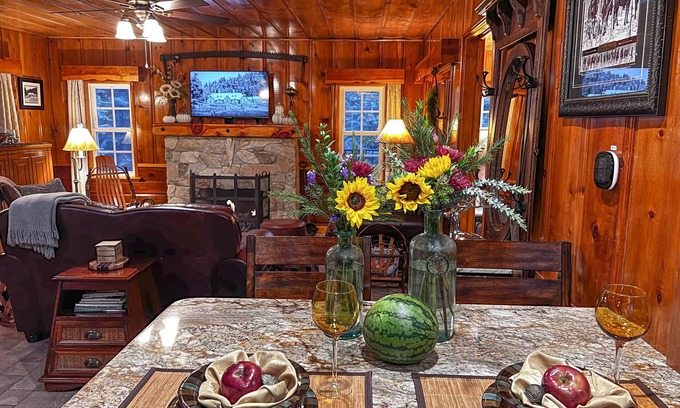 The Hershey Cabin has rustic knotty pine/redwood walls and ceiling, a beautifully hand-crafted quartz rock fireplace, a massive pine mantel, and porcelain slate tile floors with traditional wool rugs. In addition to central air conditioning & heating, it has dual pane windows and is fully insulated. Above the fireplace is a Samsung (2020) 4K, smart TV with the super easy to use Fire TV Cube. We provide Netflix, Amazon Prime, MAX, PBS Masterpiece, Acorn, BritBox, Hallmark, crackle, freevee, tubi, Pandoras etc. We have very high speed (1 Gig up & down) Frontier fiber-optic internet, with an Amazon eero Wi-Fi router mesh system. The living room is a perfect place for you to snuggle up by the fire with each other, and either read or watch a movie.