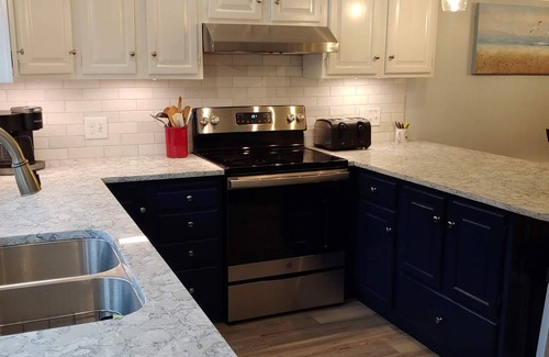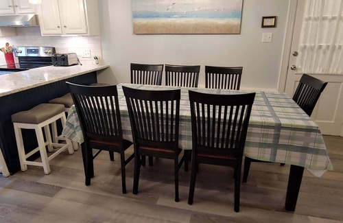 The Main house has a NEW KITCHEN, two 1st floor bedrooms and two 2nd floor bedrooms. There are full bathrooms with tubs on each floor, plus an additional 1/2 bath on 1st floor, as well as an enclosed outdoor shower in the private backyard. 1st floor bedrooms include one with king bed, one with twin daybed with pullout twin trundle. 2nd floor bedrooms include one with queen, and one with two twins and set of twin bunk beds.